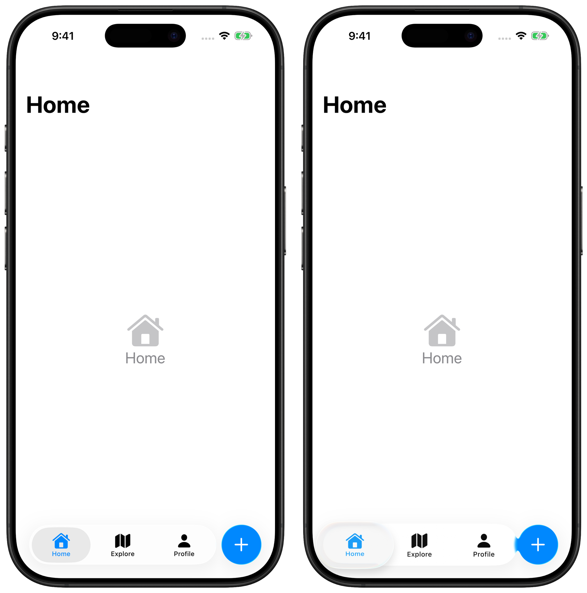 In response to my previous blog post, My Beef with the iOS 26 Tab Bar, someone suggested a solution I hadn't considered: using a segmented control (aka segmented picker) as the foundation for emulating the tab bar. They linked me to a video by Kavsoft which demonstrated the idea. Segmented controls offer the same bubbly, interactive glass effect on touch down that tab bars have. And unlike tab bars, segmented controls can be customized more easily, particularly with regards to layout and positioning.